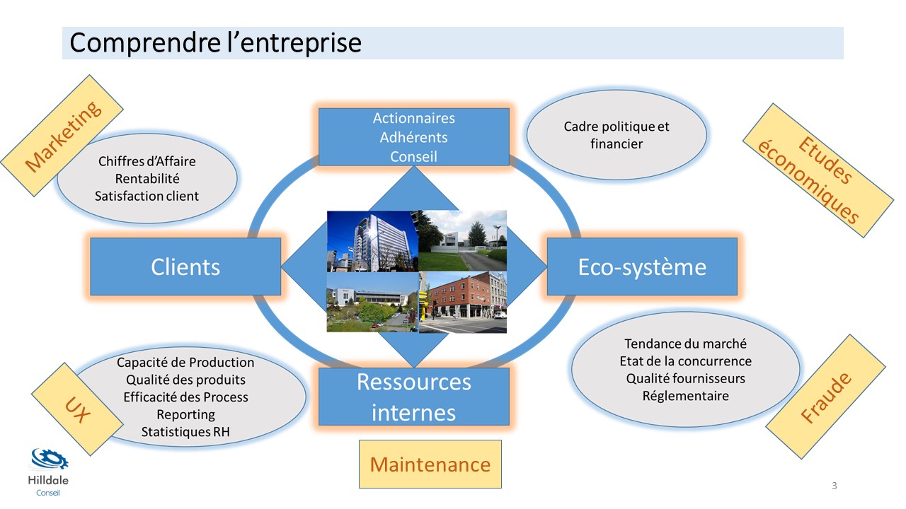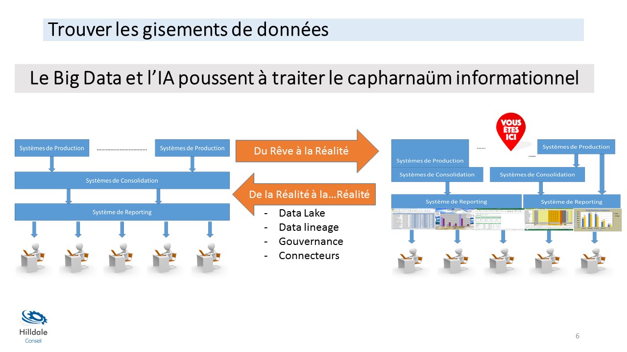 Ces 3 agents de complexité conduisent souvent à un capharnaüm informationnel. La bonne nouvelle pour le Data Scientist est que l’émergence des enjeux du Big Data pousse les entreprises à traiter cette situation. Cependant cela reste des travaux de longue halène et la capacité de trouver les gisements de données doit être une qualité première du Data Scientist. Je conseille vivement de s’intéresser de près à l’histoire du SI de l’entreprise ce qui revient au premier point clé sur la compréhension de l’entreprise. La boucle est bouclée !