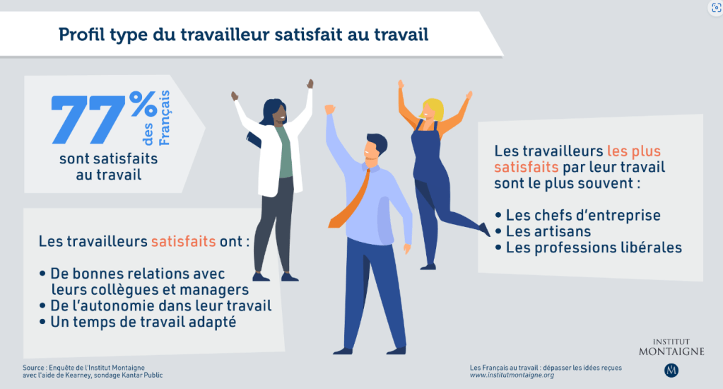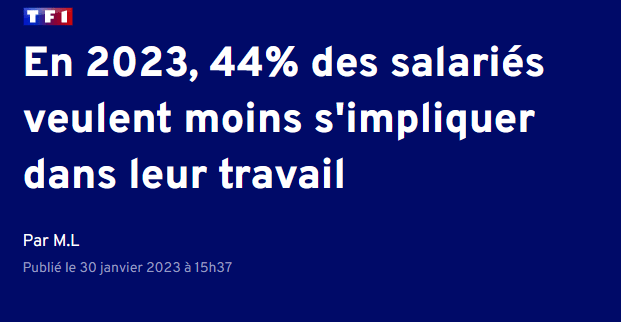 En janvier 2023, 77 % des français sont satisfaits de leur travail d’après l’Institut Montaigne qui relevait pourtant à l’automne 2022 que 49 % des français trouvent qu’il faudrait abaisser l’âge actuel (62 ans ) de la retraite ! En même temps TF1 reprend, le 30 janvier 2023, le sondage du site talent.com qui fait apparaître que 44% des salariés veulent moins s’impliquer dans leur travail.